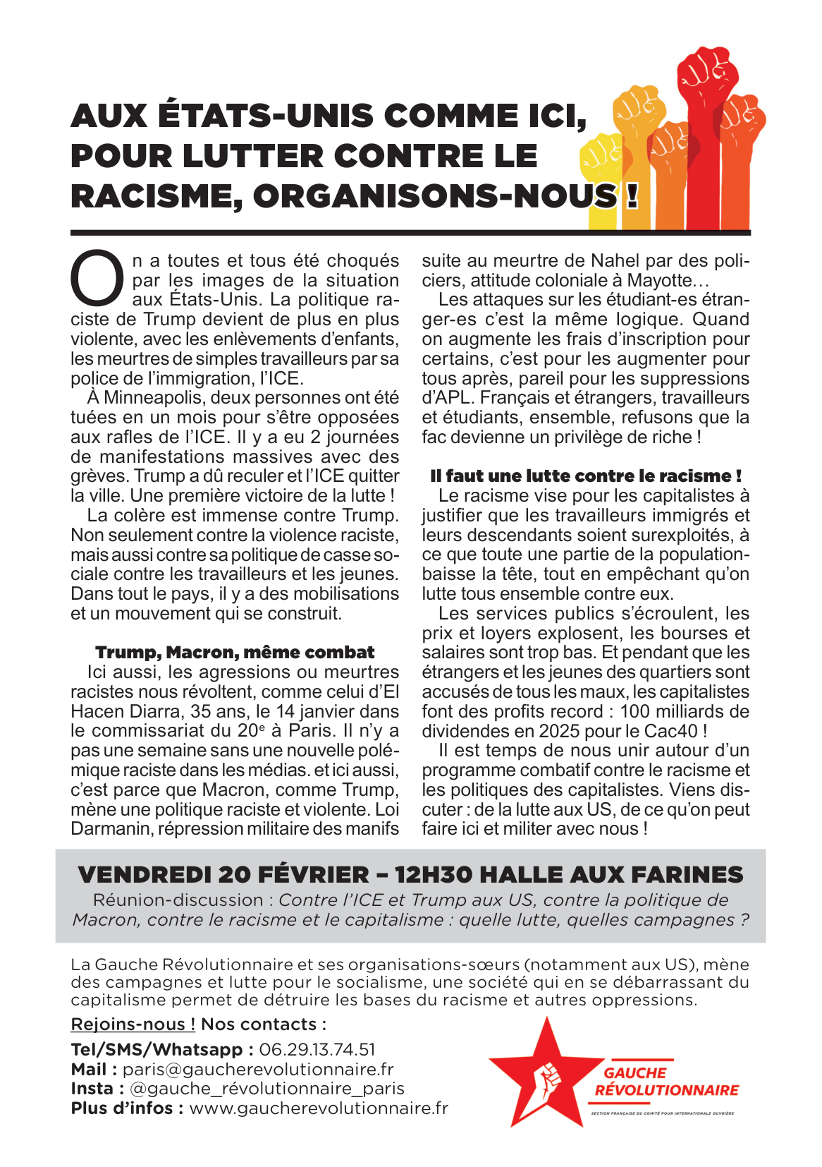 Si tu souhaites discuter de comment mener une telle lutte, contacte-nous, viens à notre réunion sur le sujet et milite avec nous ! A la Gauche Révolutionnaire on lutte pour le socialisme, une société qui en se débarrassant du capitalisme permet aussi de se débarrasser du racisme et de toutes les oppressions qu’il engendre et entretient. Viens militer avec nous !