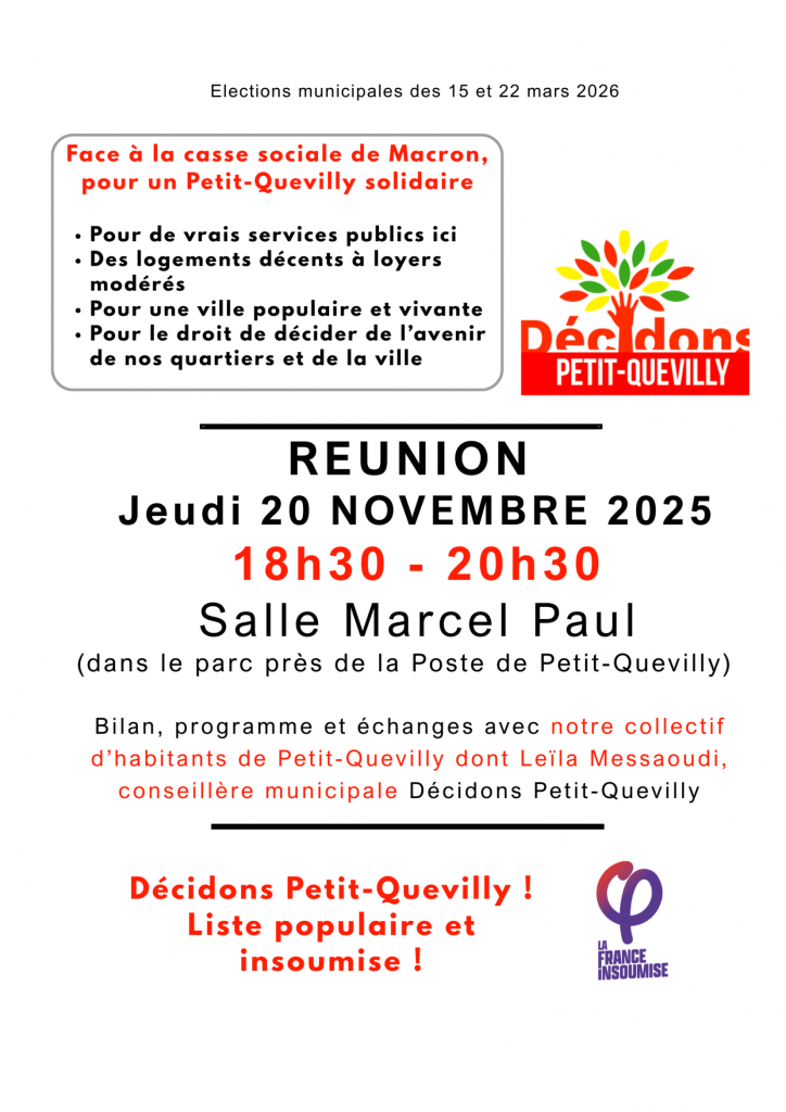 C’est le retour des élections municipales, les 15 et 22 mars 2026. À cette occasion les militants Gauche révolutionnaire et de la France Insoumise recréent une liste combative et populaire qui a pour but d’être un collectif militant : Décidons Petit-Quevilly.