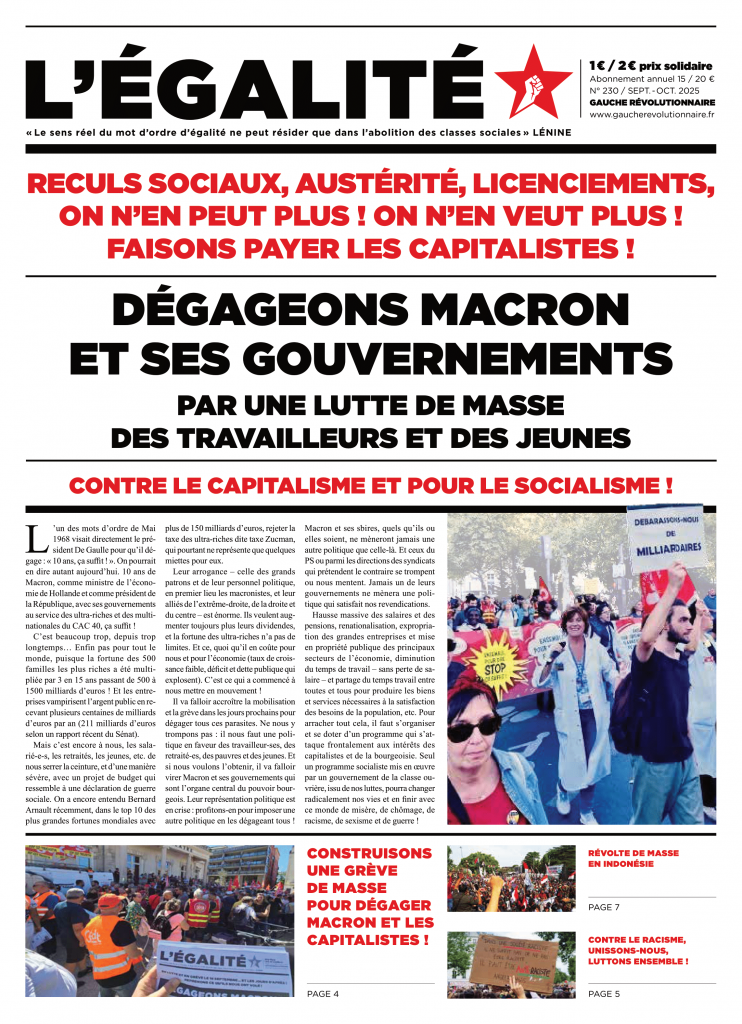 Clique ici pour télécharger l’Égalité n°230 : « Reculs sociaux, austérité, licenciements, On n’en peut plus ! On n’en veut plus ! Faisons payer les capitalistes ! Dégageons Macron et ses gouvernements par une lutte de masse des travailleurs et des jeunes. Contre le capitalisme et pour le socialisme !»
