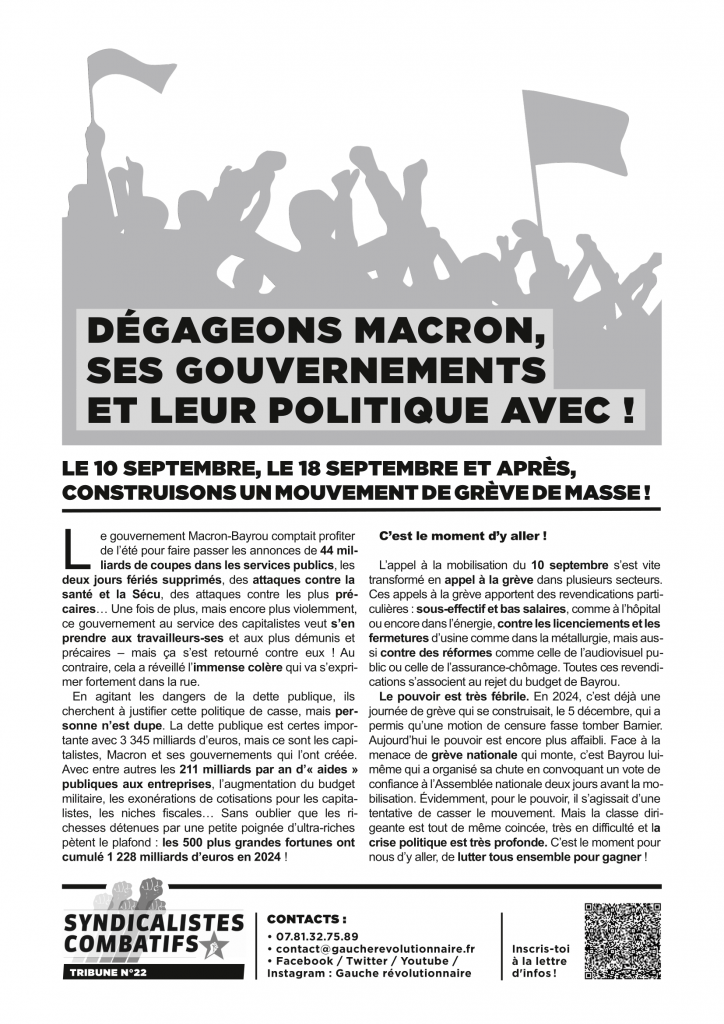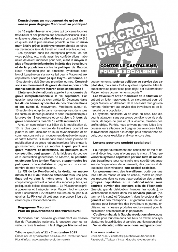 Le 10 septembre est une grève qui concerne tous les travailleurs et doit porter toutes nos revendications. Il faut en faire une démonstration de force et on a tout intérêt à ce qu’elle soit la plus massive possible, à être un maximum à faire grève, à débrayer ensemble et à se retrouver devant nos lieux de travail, en manifestation avec les jeunes. Les syndicats dans les entreprises privées, les services publics, etc. mais aussi les confédérations nationales devraient mobiliser pour cela, c’est le moyen le plus efficace de défendre les intérêts des travailleurs et de la population contre la politique de Macron et Bayrou. Nous n’attendons pas les directions syndicales cette fois-ci. La grève qui s’annonce fait peur à Macron et aux capitalistes. La chute de Bayrou est fort probable et c’est en construisant la grève et en s’assurant qu’elle soit un succès mercredi 10 septembre qu’on pourra continuer la bataille contre Macron et les capitalistes.
